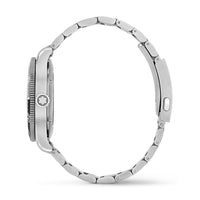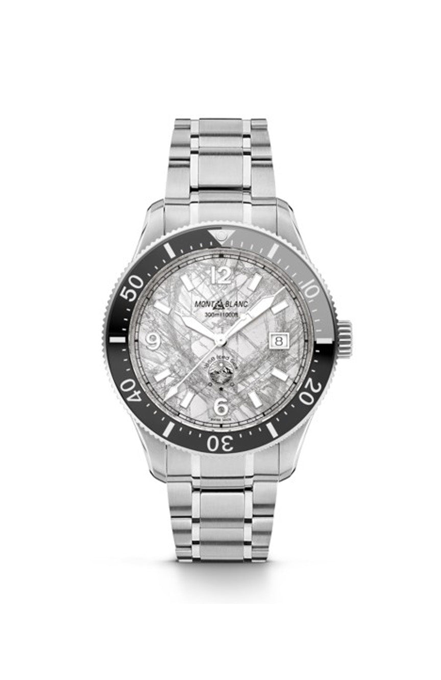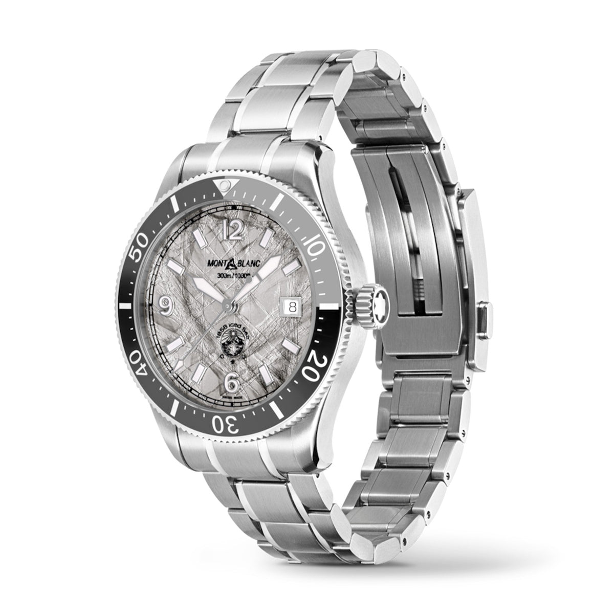 The Montblanc 1858 Iced Sea Automatic Date with grey glacier pattern dial gives the impression of looking into the depths of a glacier with all its minerals captured in time for millennia. Inspired by the Mer de Glace, this glacial texture was achieved using an almost-forgotten ancestral technique called gratté-boisé. The 41mm timepiece comes with a stainless steel interchangeable bracelet which can be quickly and easily switched for a black rubber strap with grey outline without the need to return to the boutique or the use of any tools. It is also adjustable on the wrist when wearing the watch for diving. The timepiece conforms to the ISO 6425 norm for scuba diving and comes with a water resistance of 300 metres and features luminescent markings for reading in low light.