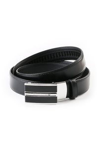 Rectangular shiny stainless steel finish buckle with leather insert and sliding mechanism. Self-adjustable, 3 cm x 120 cm, black smooth leather strap matching the Meisterstuck Leather Goods range. The brand-new sliding mechanism allows the belt to be adjusted without a pin and therefore without holes on the strap, and is easy to open and fix to the right size, thanks to the rubber insert on the back side of the strap.