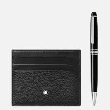 تشتمل المجموعة على قلم حبر جاف كلاسيكي مطلي بالبلاتين من Meisterstuck وجيب من 6 قطع من Meisterstuck Soft Grain Pocket. تتميز أداة الكتابة بغطاء وبرميل من الراتنج الأسود الثمين مع شعار Montblanc الأبيض المزخرف في الجزء العلوي من الغطاء. الجيب مصنوع من جلد محبب ناعم.