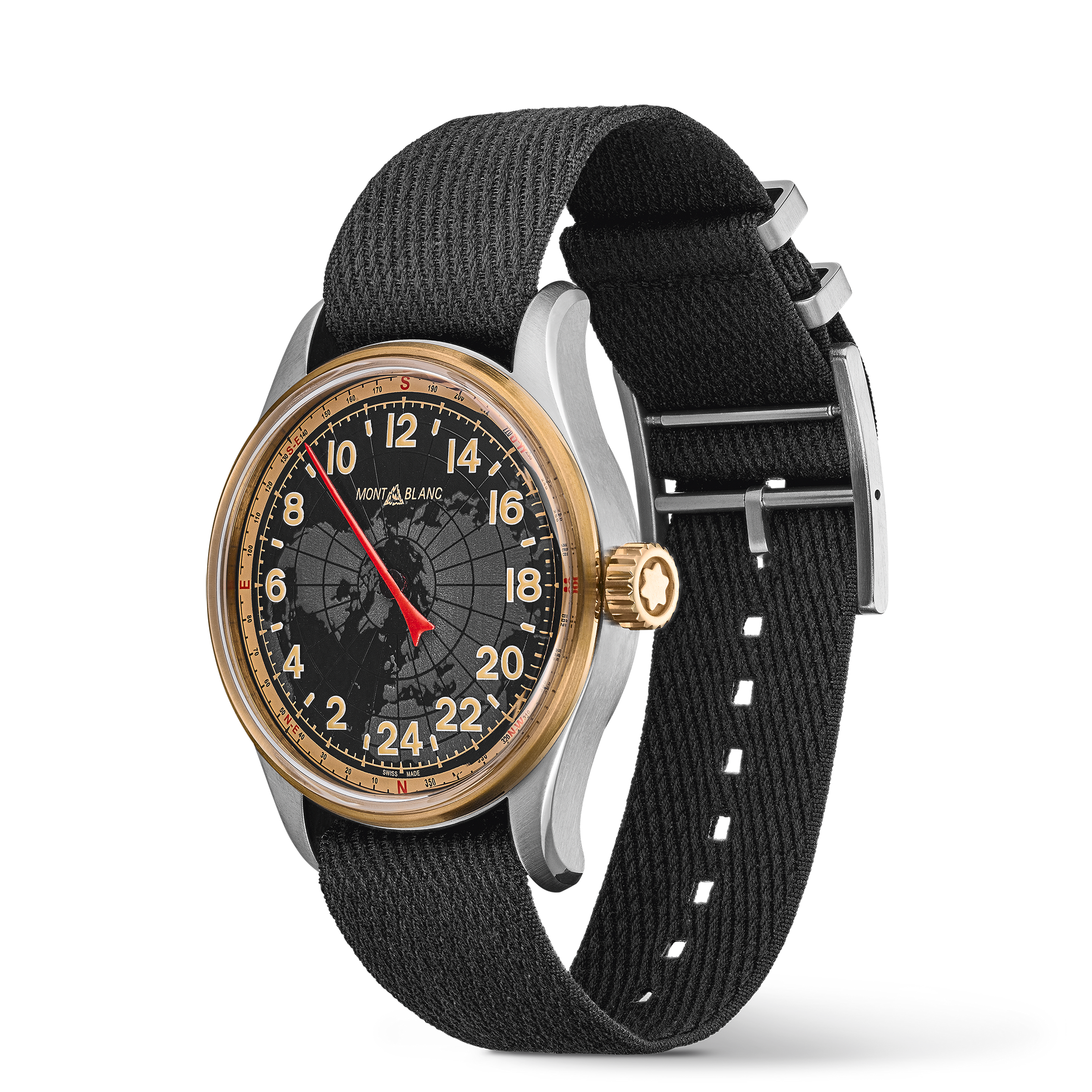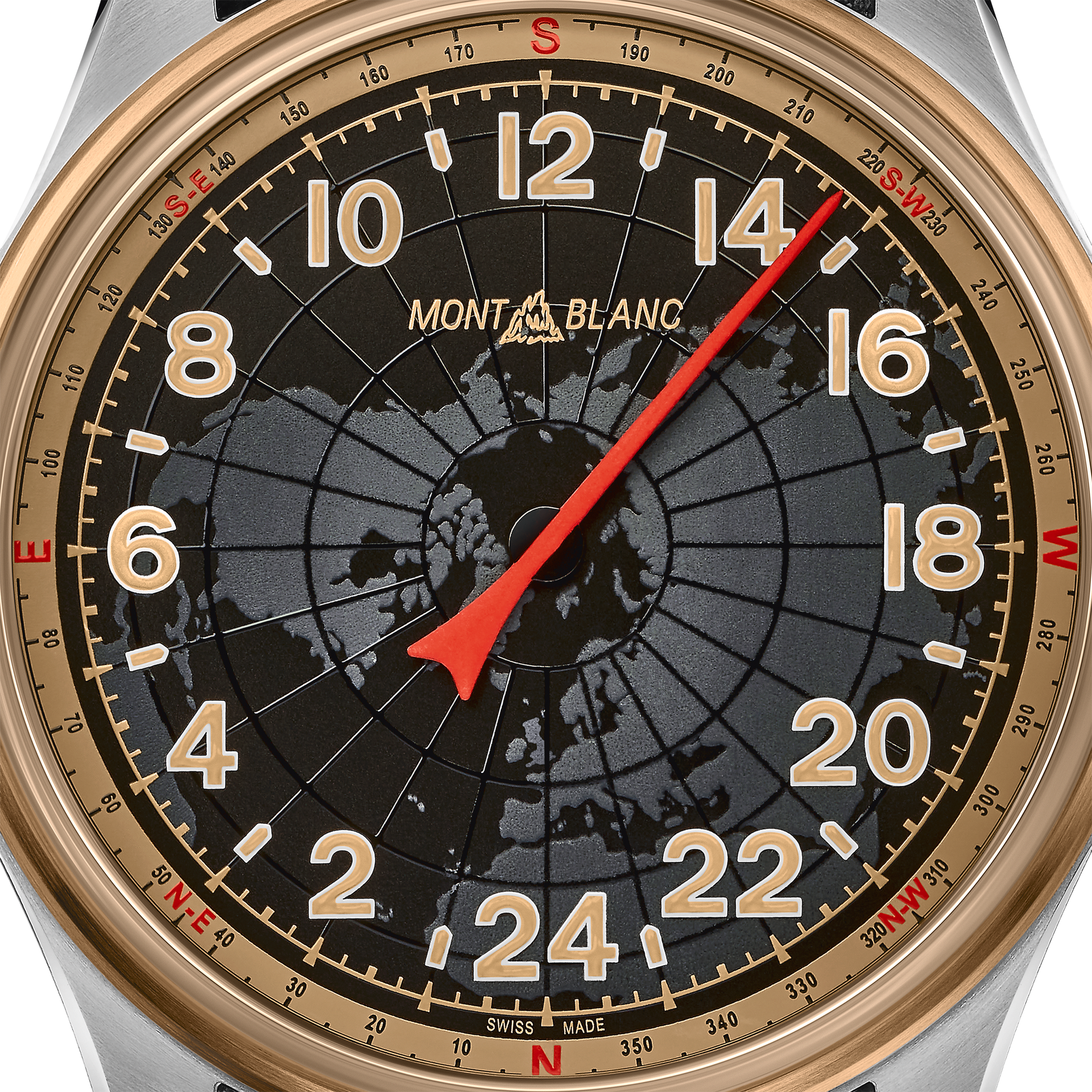 خط إنتاج مون بلان 1858 مستوحى من ساعات مينيرفا الأسطورية الاحترافية من عشرينيات وثلاثينيات القرن الماضي ، والتي تم تصميمها للاستخدام العسكري والاستكشاف. إعادة تفسير هذه الساعات الأسطورية ، يعبر خط إنتاج مون بلان 1858 عن روح استكشاف الجبال ، ويجسد الاتجاه الحديث للعودة إلى الطبيعة. مون بلان 1858 التلقائي 24 ساعة وظيفية للغاية ومخصصة لمستكشف العصر الحديث. يشير إلى الوقت على مقياس 24 ساعة باستخدام واحد أحمر اللون مغطى يدويًا في SuperLumiNova®، والتي لا تشير إلى الوقت فحسب ، بل تعمل أيضًا كبوصلة. تأتي الساعة في علبة من الفولاذ المقاوم للصدأ 42 مع إطار برونزي وقرص أسود مع أرقام وفهارس مضيئة بيج. كتفاصيل سرية ، يتميز الاتصال الهاتفي بخريطة مخفية لنصف الكرة الشمالي في SuperLumiNova®لا يتم الكشف عنها إلا في الليل. اكتملت سيارة مون بلان 1858 الأوتوماتيكية على مدار 24 ساعة بحزام منسوجات أسود مكرر مصنوع في حزام صناعة تقليدي يبلغ من العمر 150 عامًا في فرنسا.