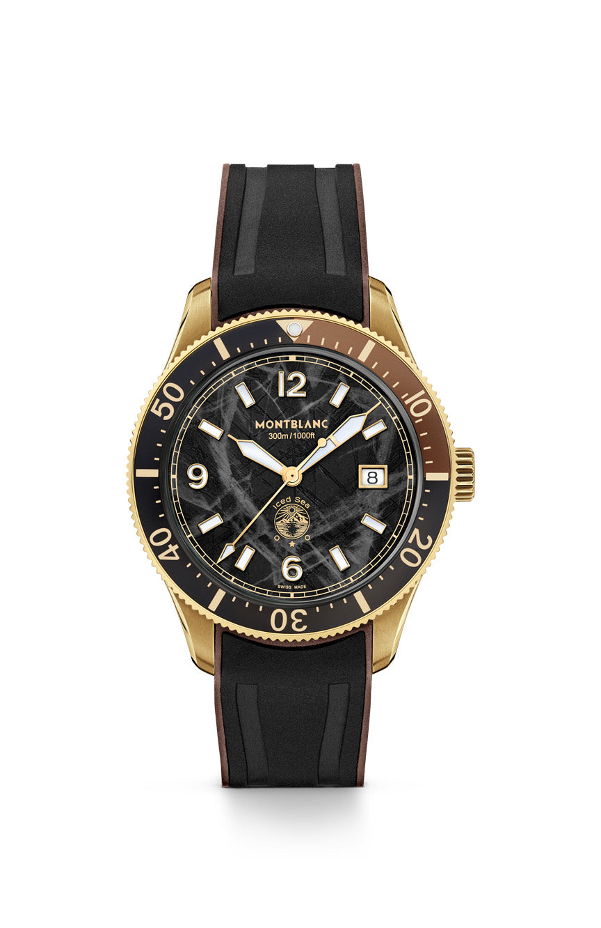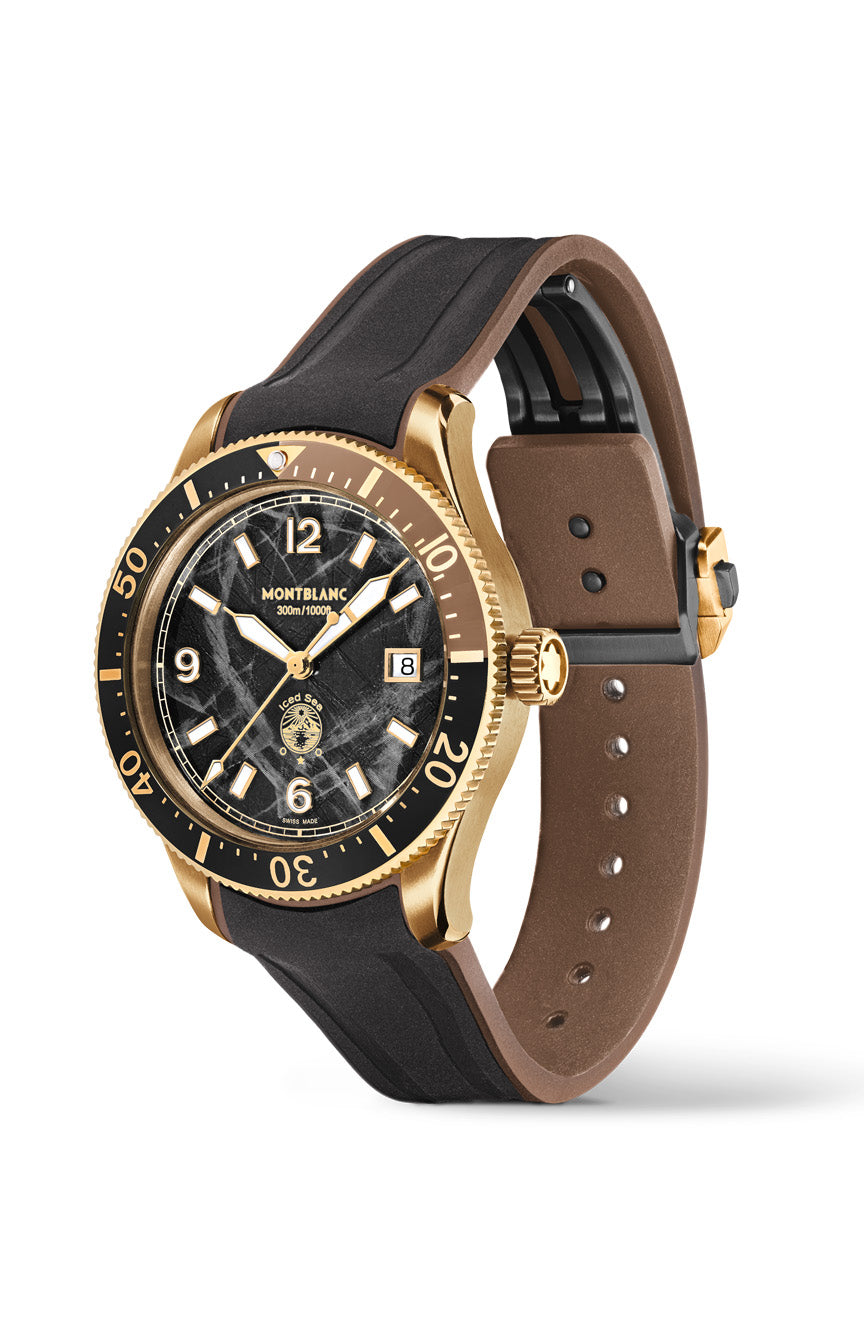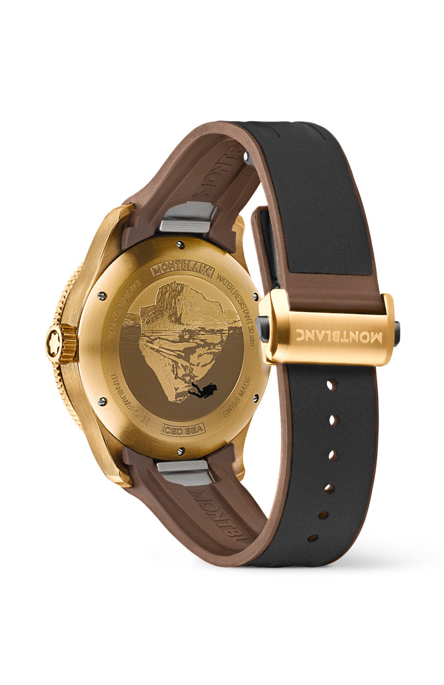 تجمع ساعة Montblanc Iced Sea Automatic Date ذات التاريخ الجليدي هذه بين ميناء أسود بنمط جليدي وعلبة برونزية دافئة، وتستوحي تصميم الميناء بنمط جليدي من Mer de Glace - بحر الجليد - وهو النهر الجليدي الرئيسي في جبال Mont-Blanc. وقد تم تحقيق نسيجه باستخدام تقنية قديمة شبه منسية تسمى gratte-boise. تأتي هذه النسخة البرونزية بإطار أحادي الاتجاه من الألومنيوم المؤكسد ثنائي اللون، ونقش ثلاثي الأبعاد على ظهر العلبة المصنوع من التيتانيوم المطلي بالبرونز، وحزام مطاطي أسود قابل للتبديل مع محيط بني ونظام ضبط دقيق. وهي مقاومة للماء حتى عمق 300 متر.