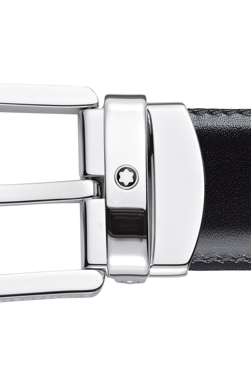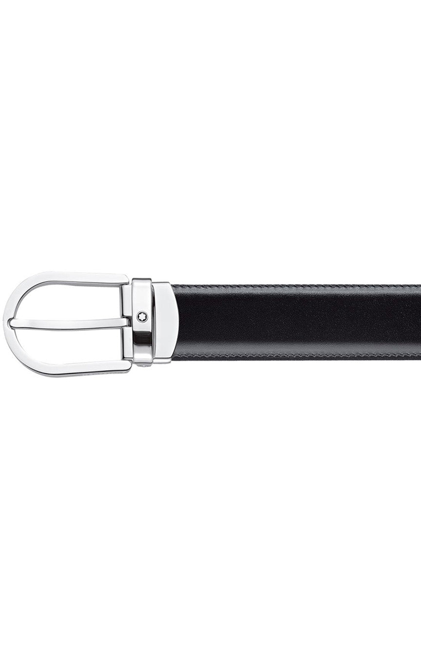 مشبك على شكل حدوة حصان مطلي بالبلاديوم لامع مع اسم العلامة التجارية Montblanc محفور على الجانبين وشعار Montblanc. حزام جلدي أسود/بني قابل للعكس، 3 سم × 120 سم، قابل للتعديل ذاتيًا. أنيق وبسيط، لأي مظهر.