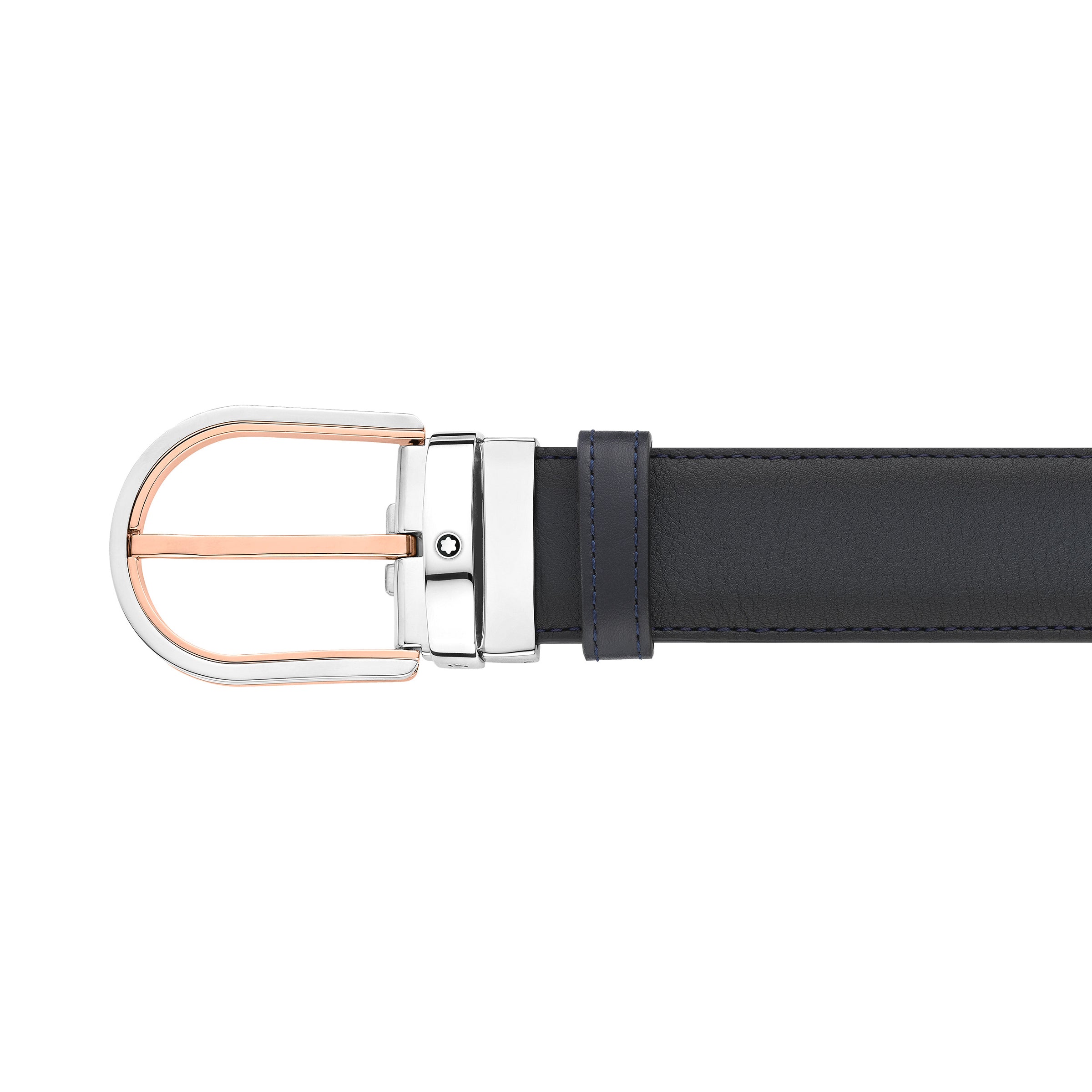 مشبك دبوس على شكل حدوة حصان من البلاديوم والذهب الوردي. قابل للتعديل ذاتيًا، 3.5 سم × 120 سم، حزام من الجلد باللون الأزرق المظلل. إكسسوار يمزج بين العناصر التقليدية والأسلوب الحديث.