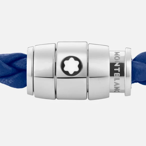 قطعة المجوهرات، المنسوجة من الجلد الأزرق، تحتوي على مشبك مصنوع من الفولاذ المقاوم للصدأ المصقول مع حلقة واحدة من الفولاذ تحمل شعار مونت بلانك.