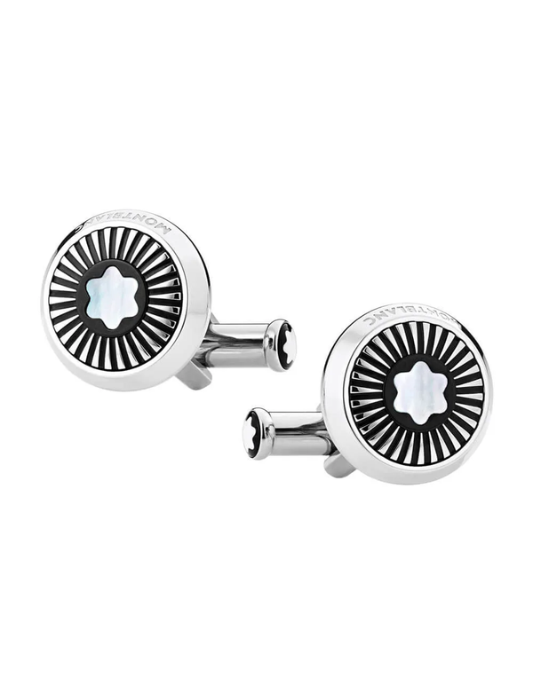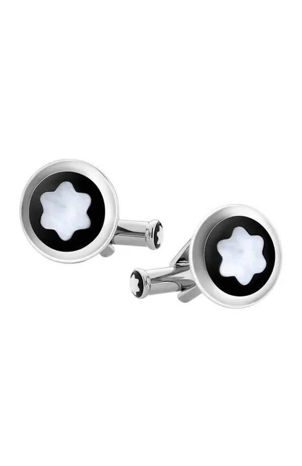 أزرار أكمام مونت بلانك دائرية من الفولاذ المقاوم للصدأ مع تطعيم باللون الأسود من مادة PVD وشعار من عرق اللؤلؤ