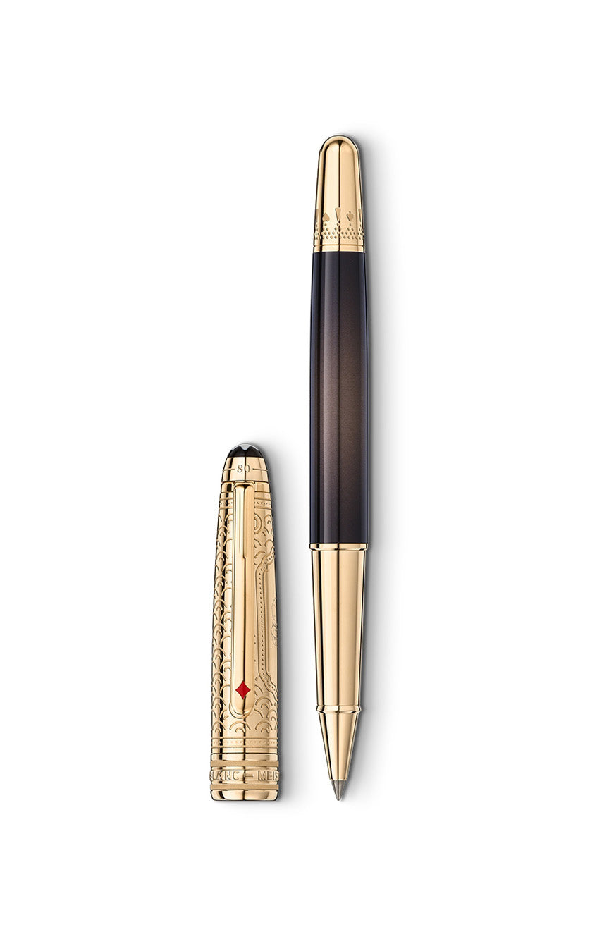 تستلهم مجموعة Meisterstück Around the World in 80 Days إلهامها من رواية المغامرة الشهيرة التي كتبها جول فيرن. يستمد قلم Doué Classique Rollerball ذو الغطاء المعدني المطلي بالذهب والأسطوانة المطلية بالورنيش الرمادي الداكن إلهامه من المرحلة الثانية من الرحلة من بومباي إلى يوكوهاما. يسافر الشخصيات الرئيسية في هذا الجزء من المغامرة على فيل مهيب، والذي يظهر في خرطوشة على الغطاء. يتميز الغطاء المصنوع من المعدن المطلي بالذهب بنمط محفور يرمز إلى الحظ السعيد. يتميز المشبك ببدلة بطاقة ماسية مطلية باللون الأحمر والمخروط محفور بنمط وبدلات بطاقة تمثل رهان السيد فوج على القيام بالرحلة في 80 يومًا. الجزء العلوي من الغطاء منقوش بطول الرحلة، 25 يومًا من بومباي إلى يوكوهاما و80 يومًا في المجموع.