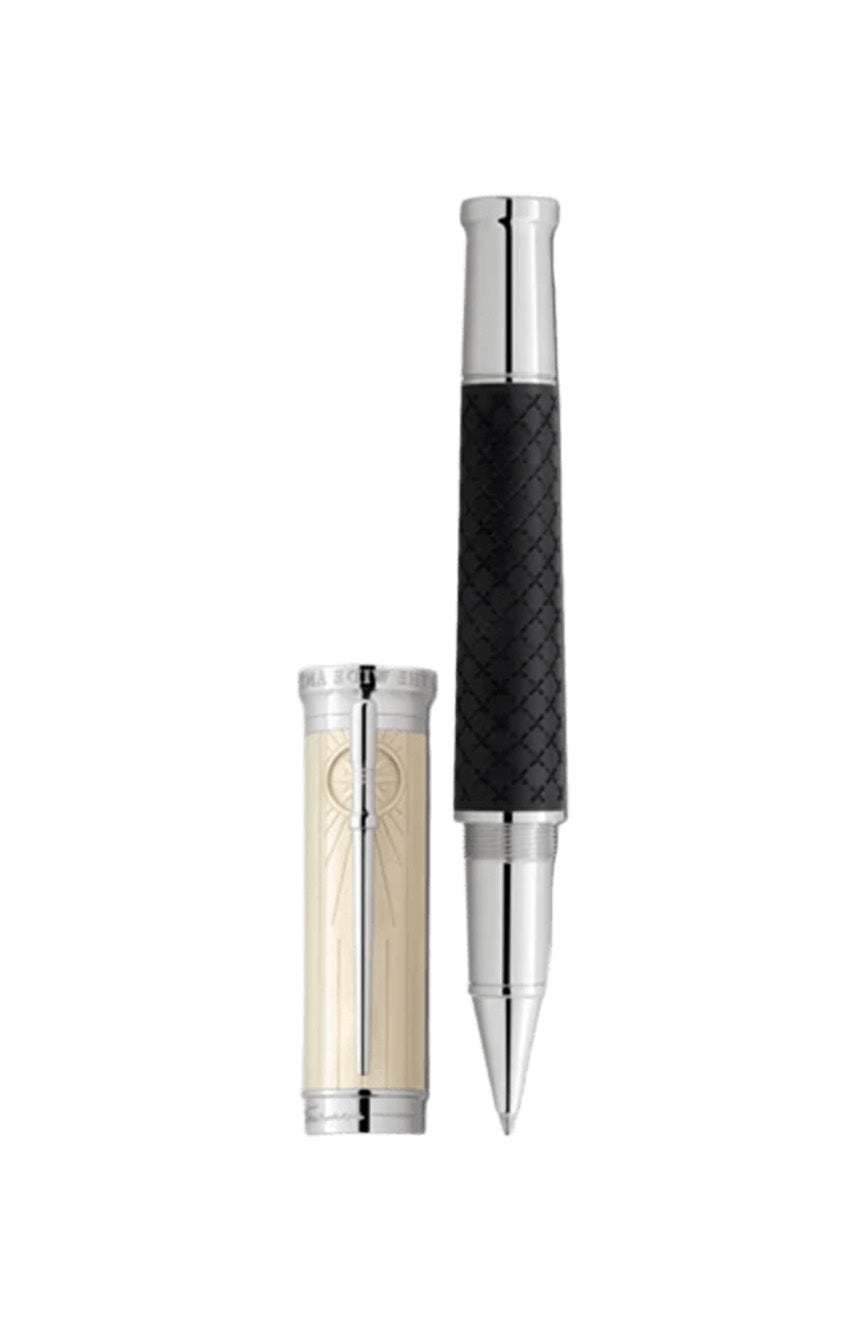 ولد روبرت لويس ستيفنسون في إدنبرة، اسكتلندا، عام 1850، وكان لديه رغبتان عظيمتان: الحرية والتسلية من خلال الانغماس في عالم آخر. ألف مقالات وروايات سفر بالإضافة إلى قصص مغامراته الأسطورية المليئة بشخصيات مذهلة ترسل أسماؤها قشعريرة في أذهان القراء في جميع أنحاء العالم: جون سيلفر الطويل، والكابتن فلينت، وجيكل وهايد. تم تخصيص Montblanc Writers Edition Homage to Robert Louis Stevenson لهذا الراوي الخيالي. ألهمت رواية "جزيرة الكنز" العديد من تفاصيل التصميم للإصدار. يتحد الشكل العام لأداة الكتابة والحلقات الموجودة على المخروط لخلق انطباع بمنظار تاريخي قابل للتمدد. تم تزيين برميل الراتينج الثمين الأسود بصلبان محفورة، بما في ذلك "X" أكبر مثل ذلك الذي يحدد موقع الكنز على الخريطة. تزين الخطوط العمودية التي تذكرنا بألواح السفينة الشراعية "هيسبانيولا" وصندوق البحر التقليدي غطاء إصدار الكتاب. خلف المشبك المغطى بالبلاتين، تتقارب الخطوط في شكل وردة البوصلة، بينما يحاكي المشبك شكل دبوس التثبيت، الذي يتم به تأمين خطوط حبال السفن. ويتوج الجزء العلوي من الغطاء شعار مونت بلانك المزين برمز القراصنة، جمجمة وعظمتين متقاطعتين، مرتفعين في وسطه. وزُينت حلقة الغطاء بنقش لتوقيع ستيفنسون إلى جانب تاريخ نشر أول عمل له "انتفاضة بنتلاند"، 1886. كما نُقشت سنوات حياة روبرت لويس ستيفنسون، 1850-1894، على الغطاء.