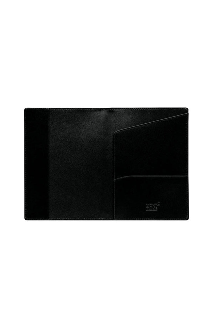 International passport holder made of black full-grain cowhide with Montblanc deep shine, jacquard lining with Montblanc brand name, and a Montblanc emblem with palladium finish ring, with pocket suitable for all international passports and additional pocket.
