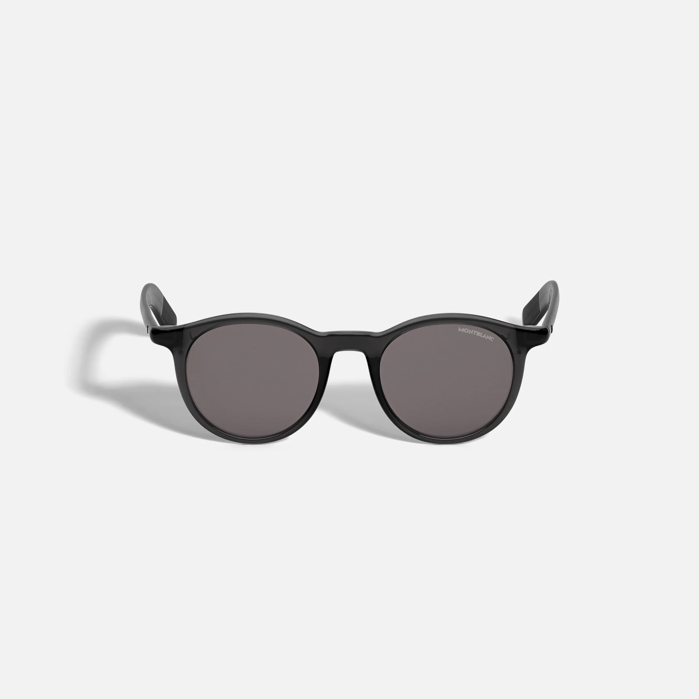 These sunglasses in a round style have a black-coloured injected acetate frame and grey lenses. The Montblanc Emblem is encapsulated in the temple design. The Montblanc logo is lasered on the left lens of the sunglasses and the anti-slip pattern is lasered onto the internal side of the temple tips to increase comfort.